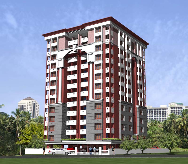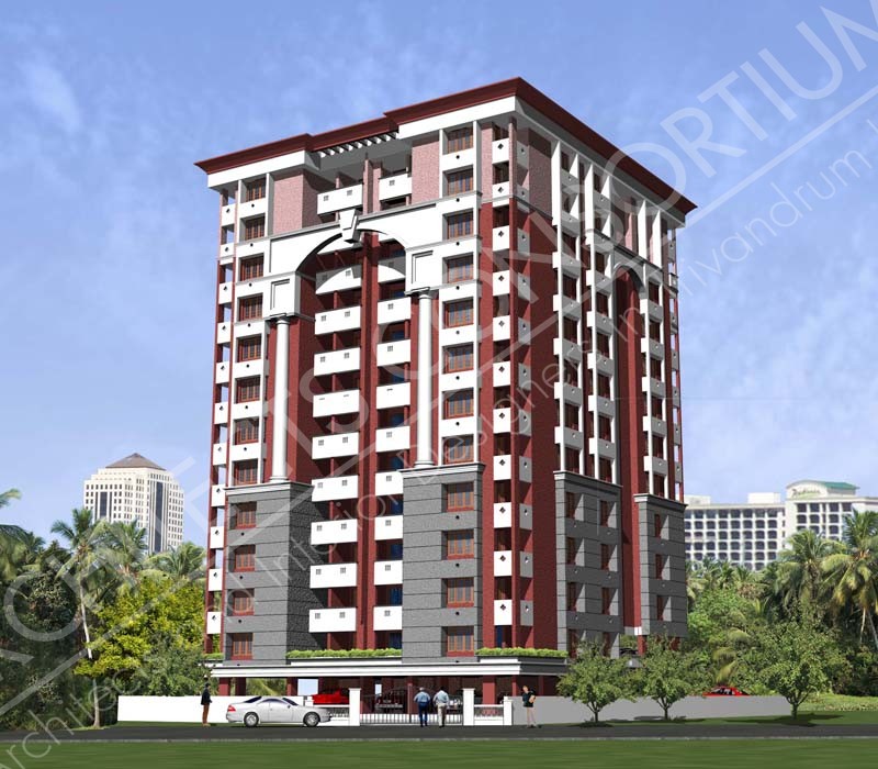 This residential building is located close to DPI Junction at Thycaud in Trivandrum district of Kerala in an area of 37 cents and is 12 floors high. The ground floor level acts as the parking space with the first floor sharing space with 2 numbers of 3 BHK flats and parking area. The rest of the floors share 4 number of flats on each floor with 3 BHK units. The total plinth area is 44500 sqft.