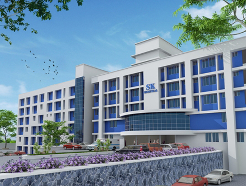 The site of 190.50 cents close to Edappazhanji junction in Shasthamangalam in Trivandrum district of Kerala is home to the SK hospital. The new block houses the inpatient rooms on a ground + 3 building with an area of 36200 sqft with a provision for 72 car parking outside it.