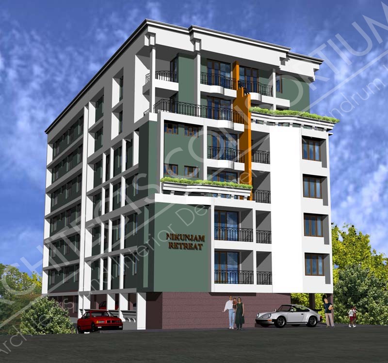 This residential building is located close to Govindans Hospital at Vanchiyoor in Trivandrum district of Kerala in an area of 37 cents and is 7 floors high. The ground floor level acts as the parking space. The respective floors share 6 flats on each floor with 5 numbers of 3 BHK flats and 1 number of 2 BHK flats. The total carpet area is 35600 sqft.