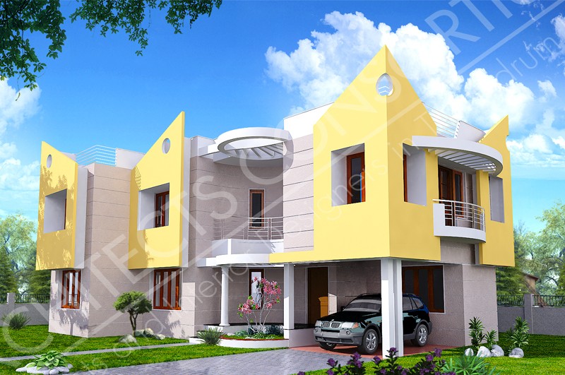 The site is at Pangappara in Trivandrum district with a site area of 6.80 cents. its innovative use of external features and curved pergola designs shading the verandah spaces, makes it a unique landmark on its surroundings. It is a 3 bedroom home. The total built up is 2750 sqft. |